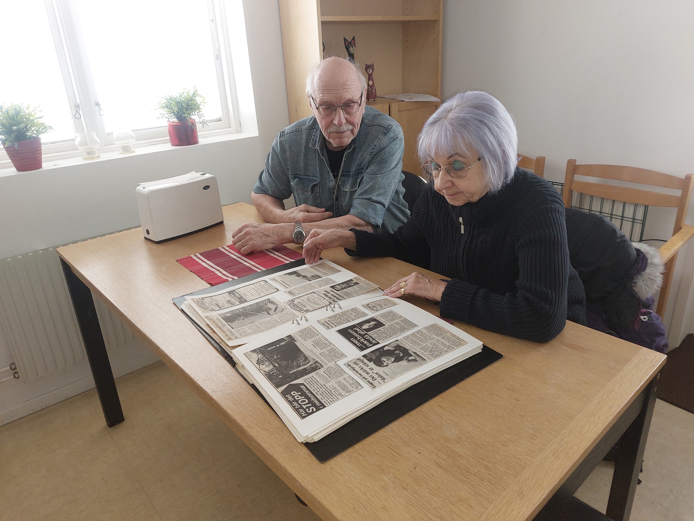 Kjell och Anita Gunérus tittar i gamla urklipp.